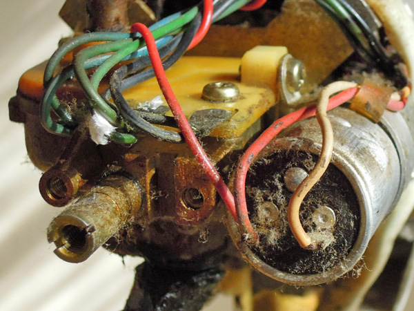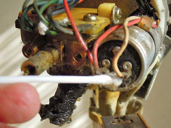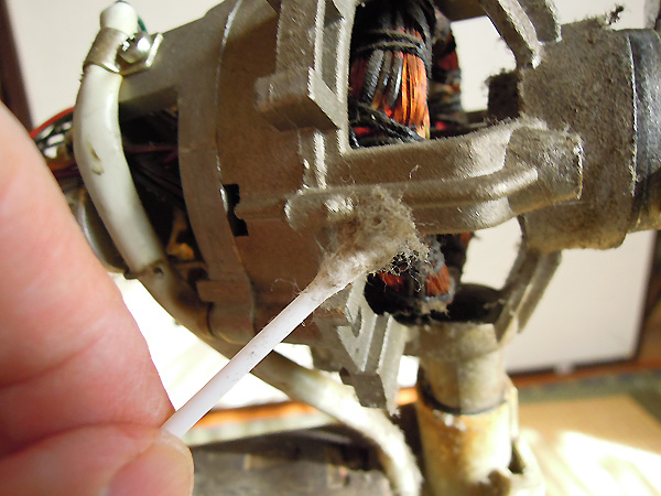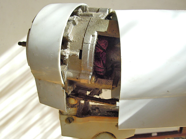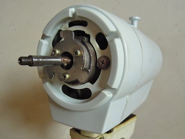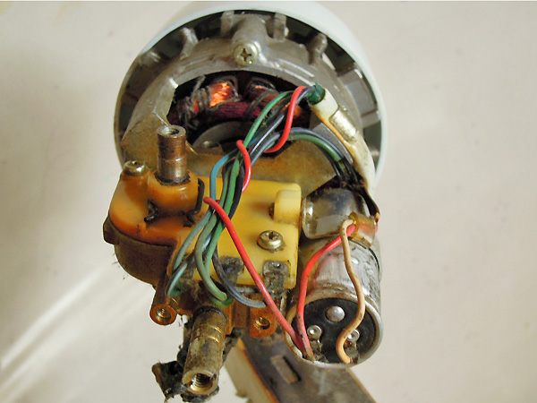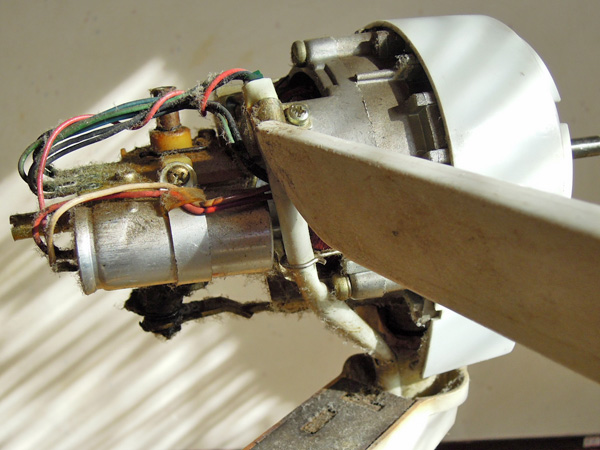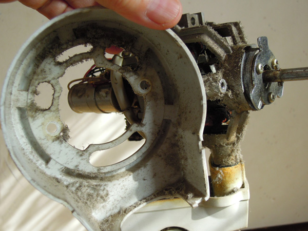 ![]() カバーを外すにはこのネジを外します。背面のネジを取るとカバーが取れます。 以前ニュースで、古い扇風機の火災に注意という放送が流れました。扇風機はハネの後の空気を前に押し出す構造になっているので、扇風機のモーターのこの風で冷却する構造になっています。モーター部分に空気取り入れ口のスリットが無いものがありますが、このタイプはスリットが同心円状に空いています。今はちょうど扇風機の役目が終わった10月で収納次いでに内部の清掃をしてみることにしました。 扇風機のモーター部分の埃の付着具合 トップへ このタイプは首振りの動力を同じモーターからとる構造です。特に火災の原因は良く報道されていますように、綿埃が電極でショートして発火するという物です。 モーターカバーを開けてみるとモーター周辺には衣類から出た綿埃の様な物が満遍なく付いていました。ご覧の通り電気配線がいくつかあり、コンデンサーらしき部品の端子にも綿埃が付いていました。その上には配線が基盤にハンダ付されていましたが、そこにも綿埃が積もっていました。 電極部分の清掃 トップへ 前カバーの取り外しと清掃 トップへ 各部分の清掃 トップへ 古い電気製品の良い所 トップへ 46年前の扇風機を掃除してみました。現在の扇風機と違って、樹脂部品が余り使われていませんのでかなり頑丈です。余談ですが、10年越しの扇風機は、ファンガードの前後の合わせ部分が打つけたショックで割れてしまっています。昔は、樹脂部品は劣化が激しいので、使用可能な箇所を使い分けてありました。