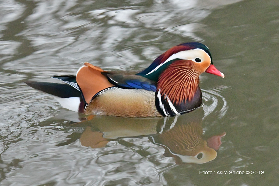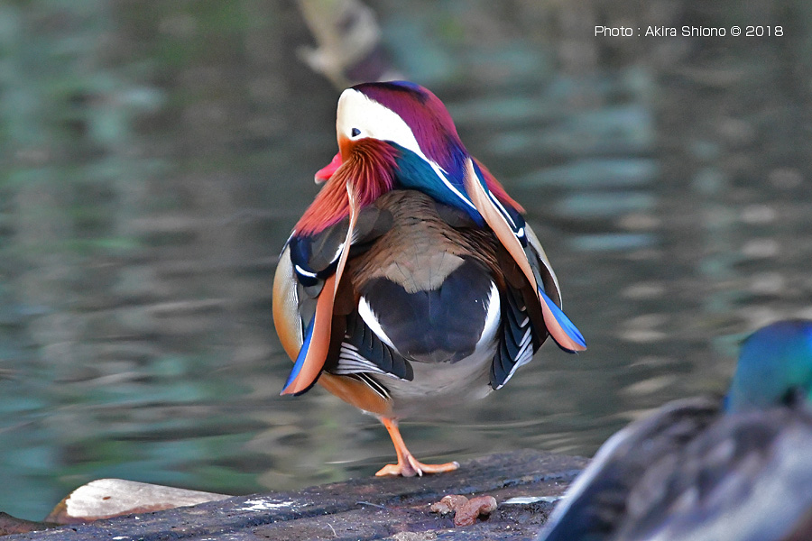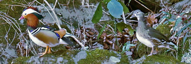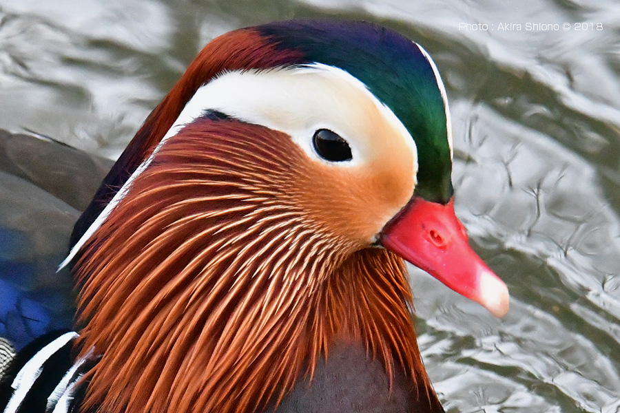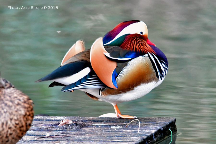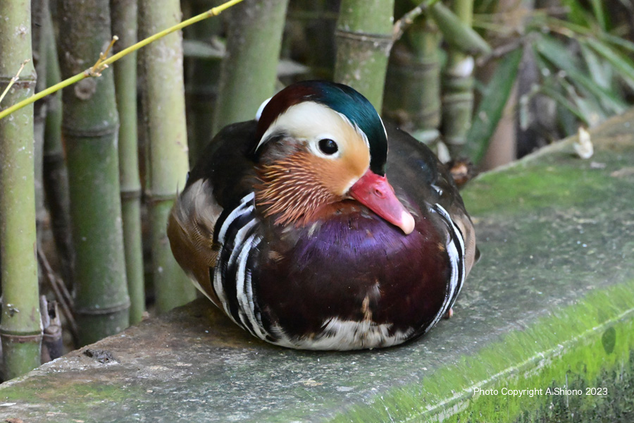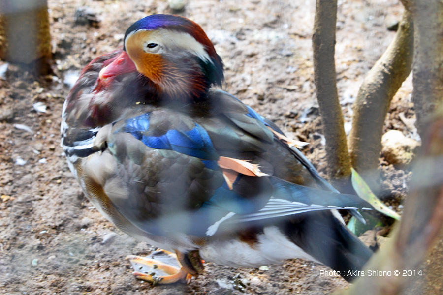 左の写真は、上野動物園で撮影したオシドリで、野生のものと色艶が全く違っています。