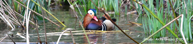 河川を含む水辺にいる野鳥の中でもっとも目にするのがの鳥です。カモ科の鳥は、ほとんど水の上を移動して住む様に足にはヒレ状指の間に水掻きが付いています。飛行するときに羽ばたきながら水面をこの水掻きで蹴って飛び立ちます。地元国分寺で目にするカモ類は、主にカルガモです。季節によっては、マガモが渡り鳥として水辺に訪れます。他にオシドリもこの「カモ科」に含まれています。また、形と大きさが違いますが、「ハクチョウ」などもカモ目カモ科となっています。 多摩動物公園のオシドリ 2018.4.29 トップへ 真夏日が続く9月の中旬に多摩動物公園に行って来ました。このオシドリがいたのがウォークインバードケージの中の人工池にいました。自然ではオスにはよく出会いますがメスを金網無しで撮影できたのは幸運でした。 ![]() 多摩動物園のバードケージの人工池の縁で休むオシドリのオス NIKON Z7+TAMRON70-300m f/4.5-6.3 設定: ISO12800 1/320/F14 0段 300mm トリミング
