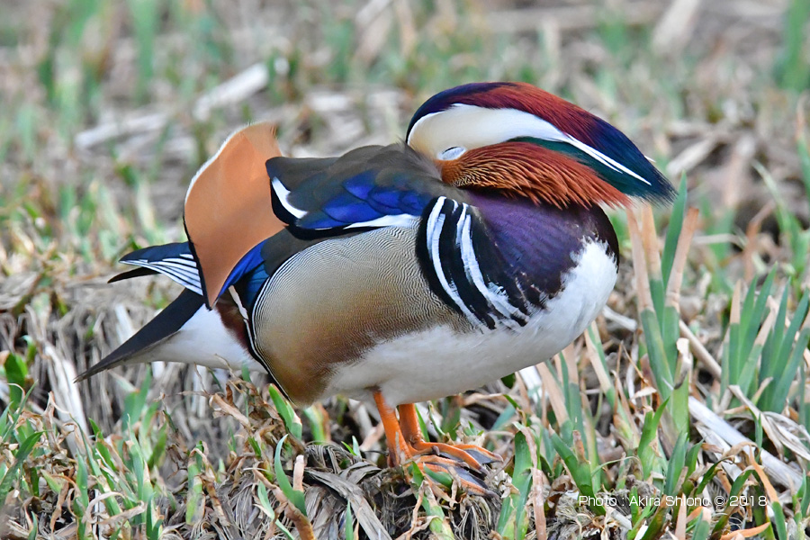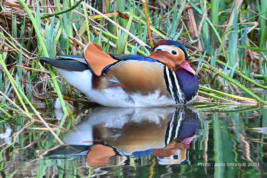 休んでいるオシドリ♂を後ろから見た写真、 水草の隠れ家は安心できる様です。