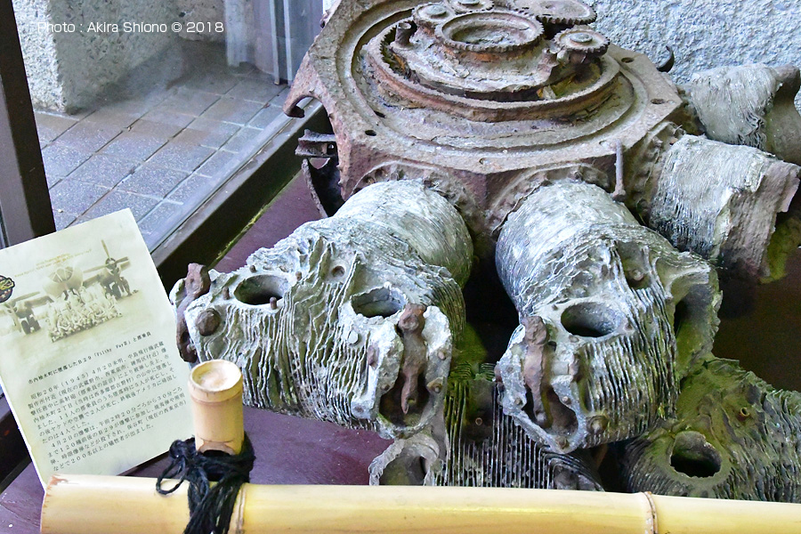 1階に入ると左側に戦争中に墜落した、B29のエンジンと飛龍のエンジンが展示されています。