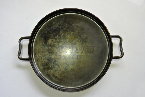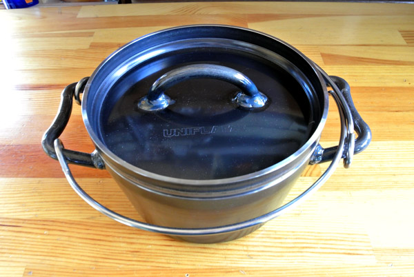 リッド(蓋)は鉄板焼きに! トップへ 鋳鉄のダッチオーブンではリッド(蓋)で肉も焼けます。フタを逆さに置いて、ステーキなどを焼くことが出来ます。鋳鉄製は裏側にすると淵がありませんので不用意に動かすと油がこぼれてしまいます。しかし中央が少し窪んでいるので少量の油でしたら中央にキープしてくれます。一方、この3mmの黒皮鉄板製のハーフダッチオーブンは、写真のようにリッド(蓋)の表面が平で縁が2cm位あります。調理時に水を入れ蒸す「餃子」なども安心して焼くことができます。蓋はフライパンにガラス窓付きの市販品で使う持ち手つきのマルチサイズ用がぴったりで、フチの高さと合わせると蓋の内側には十分な空間があります。これでしっかり蒸らすことも出来ます。 ヘラの使用は、鉄板が高温になりがちなので金属製の使用をおすすめします。 使用後の洗浄は、持ち手も高温になっていますので完全に冷めるまで待つか、耐熱グローブなどを使い火傷しないよう注意が必要です。 Coleman Enamel Dutch Oven(旧製品) トップへ 鋳物のダッチオーブンでの調理は、後片付け・保管の準備等が面倒です。鋳物むき出しの地肌の凹凸は、焼けコゲを作ってしますと落とすのに非常に手間がかかります。 掃除がとてもラクなエナメルタイプの鋳物鍋