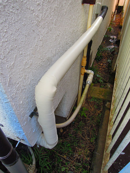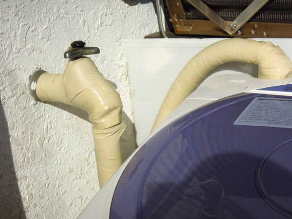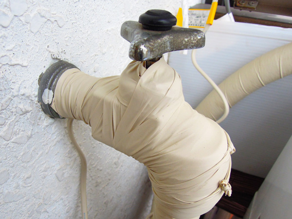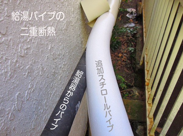 昔、室外の水道のホースは昔は布等で巻いた断熱をしていたのを見たことがありますが、結局1〜2月頃の極寒の環境では完全ではなく、凍結防止のためにコックを緩めて水を細く出していました。最近は断熱パイプが販売されていますので、さらに断熱・保温性にすぐれたこの素材で施行する事にしました。 蛇口凍結防止ヒーター トップへ