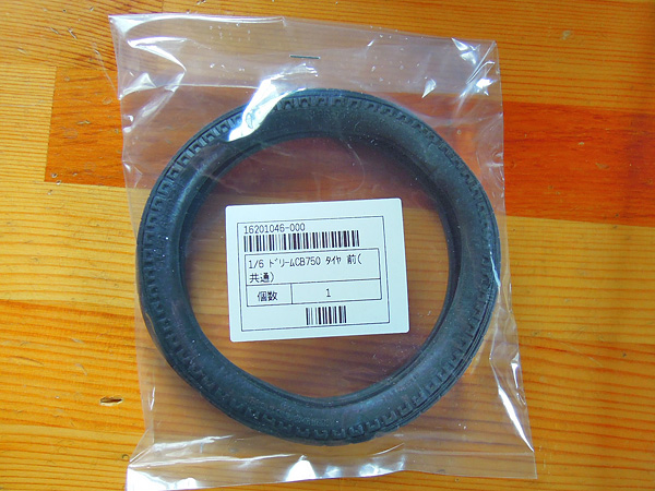 左下の写真はパッケージ撮影ので古いタイヤを入れてあります。当時販売されたタイヤは良く出来た物でしたが、惜しい事に前タイヤが後ろに比べて、幾分柔らかく出来ていたのを思い出しました。数十年箱に入れっぱなしだったので重みでタイヤの一部の形が変形して、きちんとリムに収まらずにいました。 前輪は幸いタミヤ模型に在庫が残っていたので、これも加えて購入しました。装着したのが右下の写真で、初期の物ではなく改良されたようで後輪と同様素材がしっかりしています。しっかりリムに装着できています。