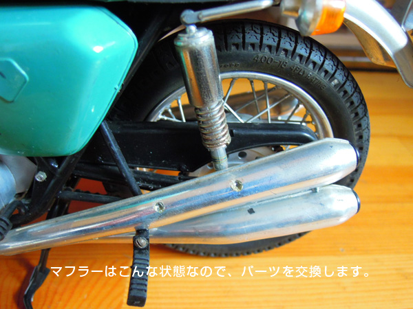 左2番のエクゾストパイプが欠損し、メッキが劣化。 新たに取り寄せた部品を装着