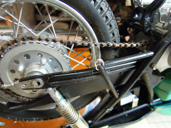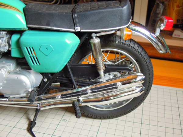 メッキ部分の劣化が特に目立っています。この製品は、先述しましたように、金属パーツが使われています。下の写真のリアショックアブソーバーの上のカバー部分もそうで、このパイプは真鍮メッキでマフラーのようにツヤがありませんでしたが、金属磨きのピカールを綿棒につけて磨いてあります。樹脂パーツの方はメッキ層がかなり薄いために、磨くと地がカンタンに出てしまいますので、修復は難しいと思います。