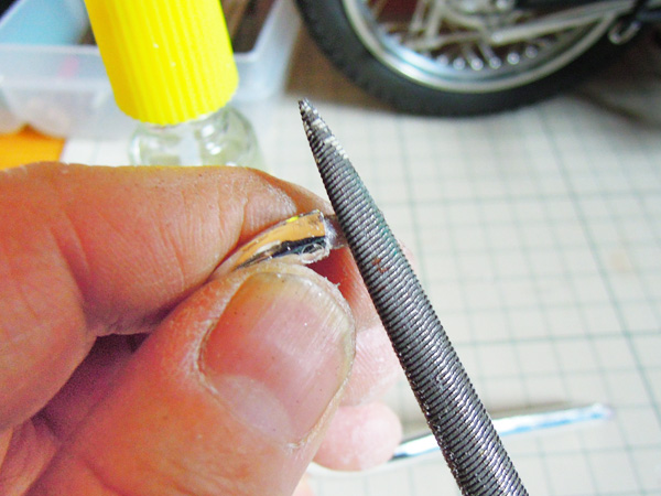 交換した部品はメッキパーツとタイヤです。ちなみに右下の写真はメッキ部品の接着の下準備で、しっかり接着するように、メッキを棒ヤスリでキレイに剥がします。