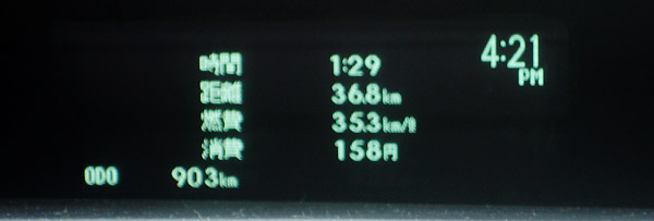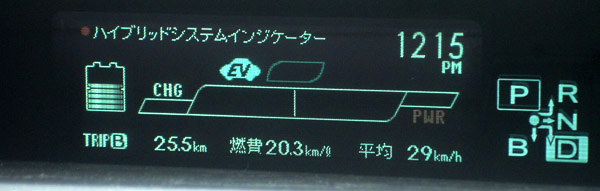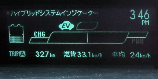 向かった先は勾配が少ない羽村で、片道約20km位走ってみました。往路はECOモードで五日市街道を利用しました。五日市街道の16号に出る辺りは午後の混雑する時間帯で、ノロノロ運転でしたがこの状況こそハイブリッドシステムの強い所だと感じました。なぜならば、エンジンのみの車は当然こんな状況では燃費はガタ落ちです。しかしシステムインジケータを見ると、チャージしている以外は殆どエンジンは停止しています。行きの燃費は約21km/L位でした。 ごく近場利用では伸びない燃費 トップへ