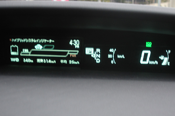 気になる燃費は、当然走行する地形・条件によって違ってきますが、ECOモードで、ちょい乗りで16km/L〜20km/Lくらいでしょうか? (2012.3.11の走行) 1週間後にほぼ同じルートでECOに気を使って走ってみました。今回はいかに燃費を伸ばすかにチャレンジです。前回は購入直後のため、ガソリン車のエコ走行を応用してみました。しかし、今回は、インジケーターの右にある0〜40km/Lのメーターに対応しながら走行してみました。 (2012.3.18の走行 下りで高燃費) 今回のコースは3/4と同じ御岳です。この日の行きの燃費がうろ覚えだったので今回は改めて確認する事にしました。以前大体26km/Lとお知らせいたしましたが、上りの影響が多く出てしまっていて約22km/L程度でした。途中の写真ですが、ここにあります様に下りの帰途では街中に入る迄は36.7km/Lで、途中発進加速にPoweModeを使用して下りの多かったコースで帰宅までの燃費は30.7km/Lでした。 しかしこのPoweModeはEcoModeに慣れてしまっていると、加速はトヨタのカタログで“2.4L並みのパワー”とうたっているように別の車のような鋭い加速をします。エネルギーモニターにモード変更してみると、モーターとエンジンの両方が作動しているのを確認しました。しかし燃費の方は期待が持てませんので、速度が乗った後にEcoModeボタンを押してモード変更しています。(写真はシャッターのせいか非表示部分が出ます)(2012.3.20の走行 渋滞でも高燃費・使えるPOWERモード)