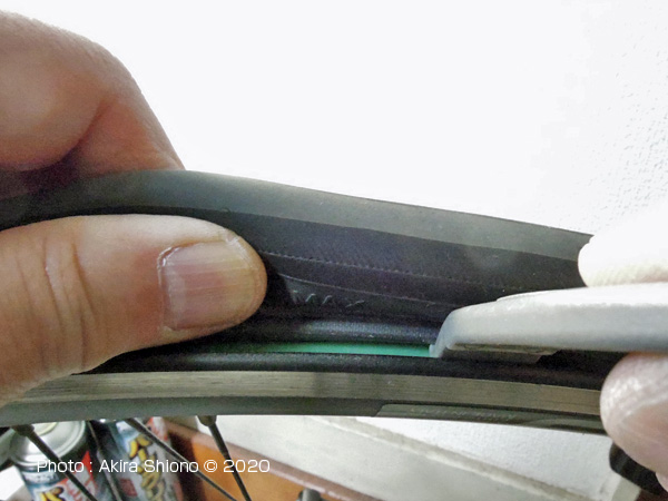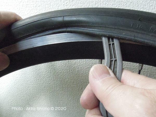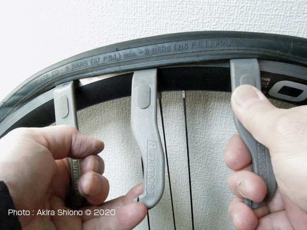 ビード部がとても硬いのでレバー3本で、一気に引き起こします。めくれたらレバーでリム外しします。