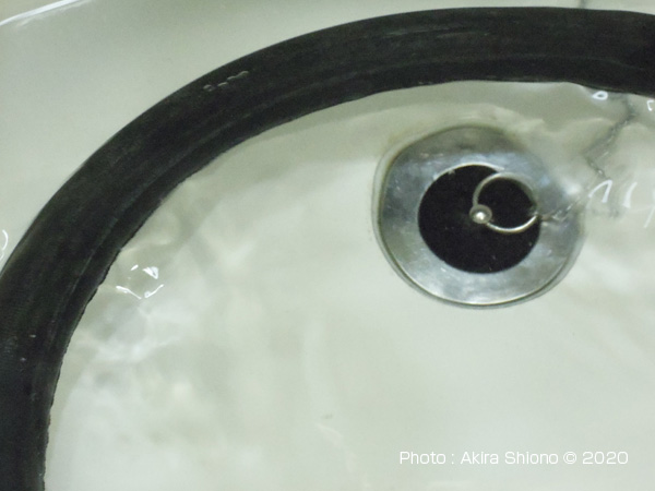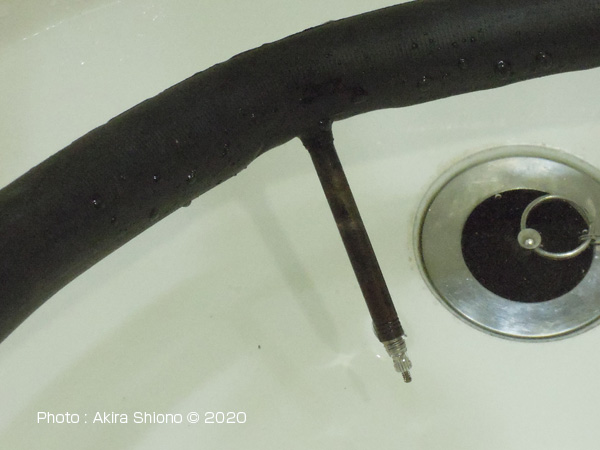 空気漏れの箇所を探す トップへ ここでは、空気漏れの箇所を探します。普通のパンクの穴探しの工程とおなじですが、念のためにバルブも水中に入れ空気漏れを確認します。 バルブコアも水中で目視確認します。 トップへ