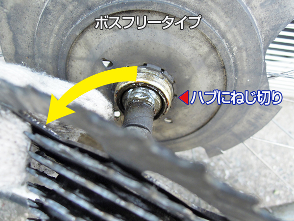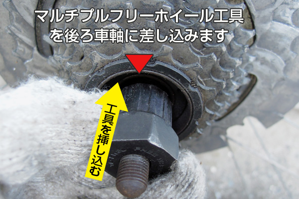 ![]() ボスフリー用のスプロケットリムーバーをシャフトに通し、スプロケットに溝に差し込みます。