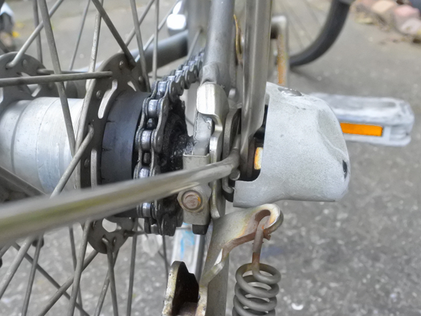 ブレーキワイヤー・後輪を外す トップへ ![]() リアのVブレーキアームからワイヤーを外します。 15mmメガネレンチを使ってナットを外します。 作業をするために車輪をはずしますが、最初にリムを挟み込んでいるブレーキを解除します。写真のVブレーキの場合はレバーの上部分にバナナパイプがあり、その中をインナーワーヤーが通っています。この部分を引っ張ってみるとカンタンに外せます。余談ですが、ママチャリの前ブレーキはほとんどが、ワイヤーを止めてあるナットを緩めるとブレーキが開きます。 スプロケットを取り外す トップへ