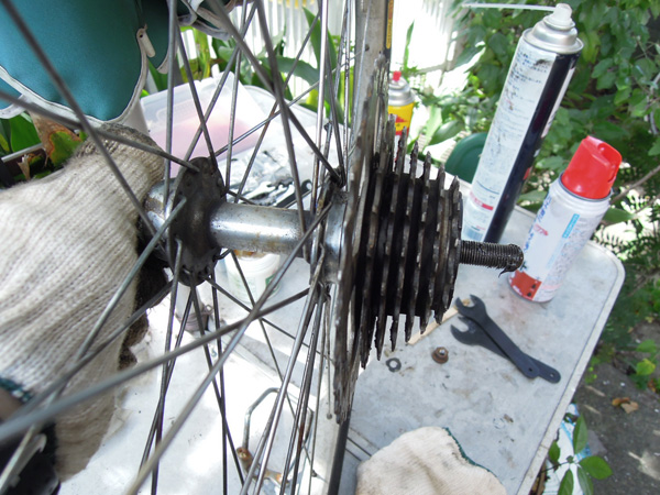 ![]() リアスプロケットが緩んだらを回して取り外します。 スプロケットを外したリアハブには、ハブに取り付け用のネジ山が切ってあります。 工具を舐めてしまう原因は、力を入れても回らないと違った方向へ工具が滑ってしまうためです。レンチと工具を組み合わせた後にメガネレンチより大きなワッシャーあれば、それを入れてシャフトのナットを締め込んで回せば回避できると思われます。 ベアリング周りを清掃する トップへ