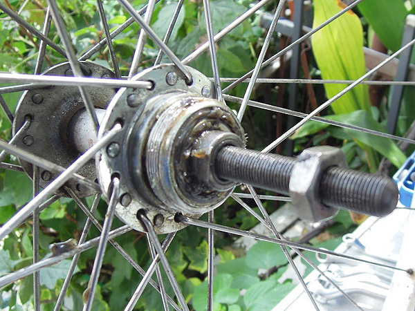 シャフトのパーツを入れて「ガタつかずスムーズに回る様」に、玉押しを調整後します。スプロケットをねじ込みます。
