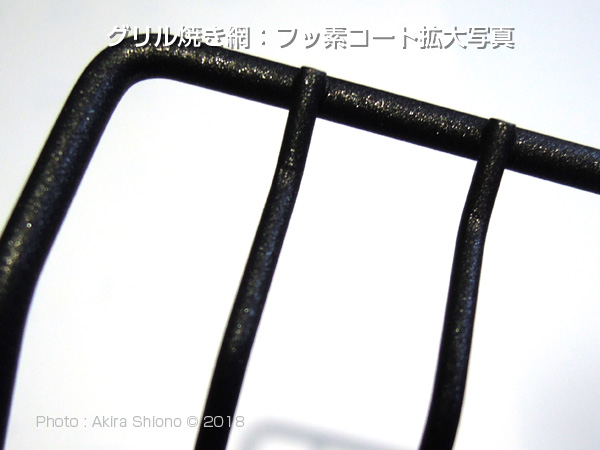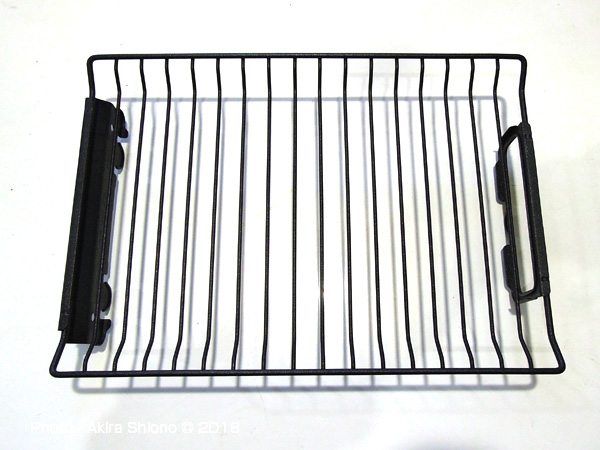 フライパンなどでもそうですが、フッ素加工などの「焦げ付き防止加工製品」は調理の時は油を使わないで出来たり、後片付けがとてもラクだったりして、なくてはならない加工です。左の写真がグリル焼き網(フッ素コート品)です。最初から付いていたグリル焼き網は、クロムメッキ製で新しい内は問題がありませんでした。焼き網もくっ付きだしたフライパンと同じく、焼き魚の皮が剥がれてしまったり、切り身の場合取り出す時に割れてしまったり残念な結果になることがありました。こんな時、このフッ素加工品は、かなり気持ちよく調理ができるようです。やはり、他の使用レポートを見ると、使う時に油を引いた方がいいようです。しかし、使用後はデリケートなコーティングですのでスポンジなどソフトな素材で洗うと寿命が伸びます。 古い焼き網をコンパクトに捨てる トップへ