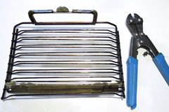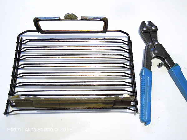 切り方はこの場合は横に渡る棒が16本ありますので、捨てる時に重ねますので、左右の7本と9本の棒の間をカットします。こうすると重ねてもコンパクトに纏まります。網端の隙間に差し込みますので長さがちょうど良くなります。脚部分を同方向に向けて組み合わせるとまとまりが良くなります。 消耗品:バーナーキャップ・グリル焼き網 トップへ 修理部品と工具を見る