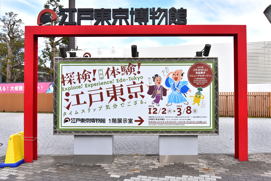 【江戸博の概要】 東京都江戸東京博物館は、江戸東京の歴史と文化をふりかえり、未来の都市と生活を考える場として平成5年(1993年)3月28日に開館しました。高床式の倉をイメージしたユニークな建物で、開館以来、東京を代表する観光スポットとして、多くのお客様にご来館いただいております。 常設展は、徳川家康が江戸に入府してから約400年間を中心に、江戸東京の歴史と文化を実物資料や復元模型等を用いて紹介しています。さらに、1階展示室で開催される年5〜6回の特別展に加えて、講座や体験教室など様々な活動を展開しています。 東京の新しい文化創造の拠点として、また皆様の憩いの場として、大いに活用していただけることを願っています。 (江戸東京博物館サイトより抜粋) |