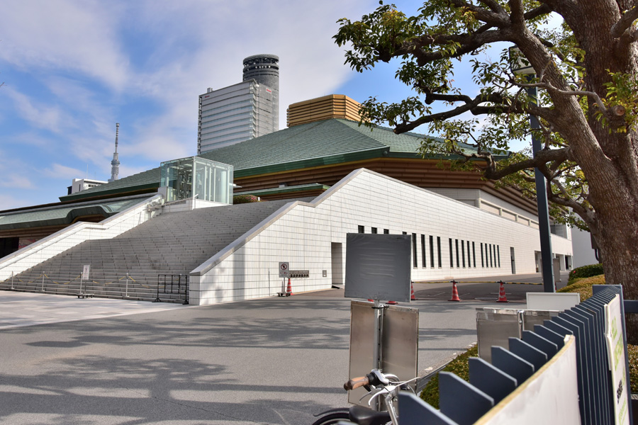 国技館は、1954〜1984年までは台東区蔵前の蔵前国技館でしたが、1985年からは現在の両国の両国国技館で大相撲が行われています。ここは元、国鉄時代の国鉄バス駐泊所(両国貨物駅跡地)として使われていました。国技館の収容人数は11,098人で建物は地上2階、地下1階となってます。高さは約40mで延べ床面積は3万5千平方メートルとなっています。他のイベントがスムーズに行われるように、櫓と土俵は昇降がエレベーター式となっていてます。土俵は地下へ格納式となっていて、やぐらは天井まで引き上げられます。