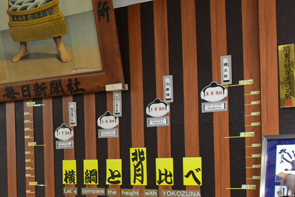 ![]() 左ー大相撲のメッカで駅内には相撲に関わる展示があります。右は歴代横綱の背の高さを実感出来るメジャーが壁に示されています。 両国国技館 トップへ