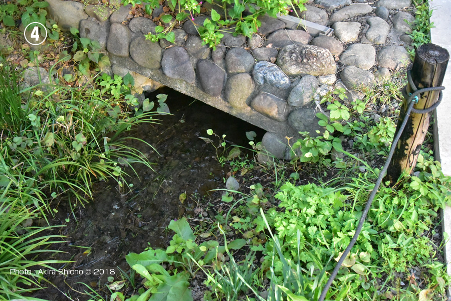 ![]() 姿見の池手前で分岐した流れは通路の北側を流れから側は排水口、一方は南へ向かいます。