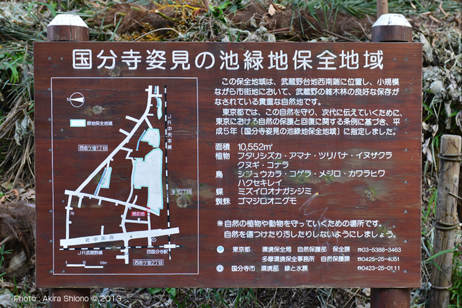 ![]() 姿見の池緑地の入り口で、後ろに見えるのは西国分寺駅側府中街道にある「西国ライフタワー」 ![]() 姿見の池の西側の雑木林の近くにある「国分寺姿見の池緑地保全地域」の看板 撮影:NIKON D810+24-70mmf2.8,D800+24-85mmf3.5-4.5VR 姿見に訪れる野鳥 トップへ ![]() 姿見の池の南の岸から飛び立つアオサギ。