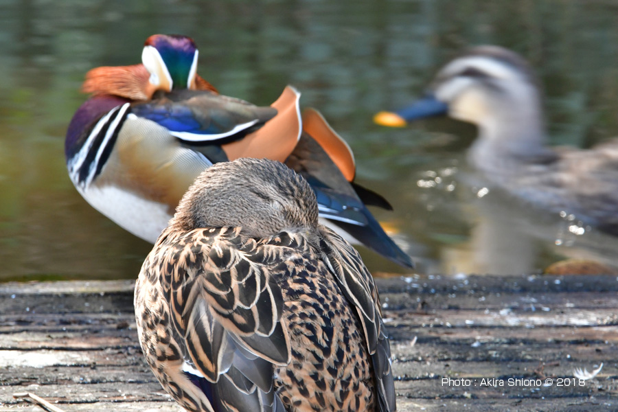 鮮やかな色をした「オシドリのオス」は首を縮めた姿をよく見かけます。 3月中旬の姿見の池と湿地(2018)カモたち 3月中旬の姿見の池と湿地(2014)