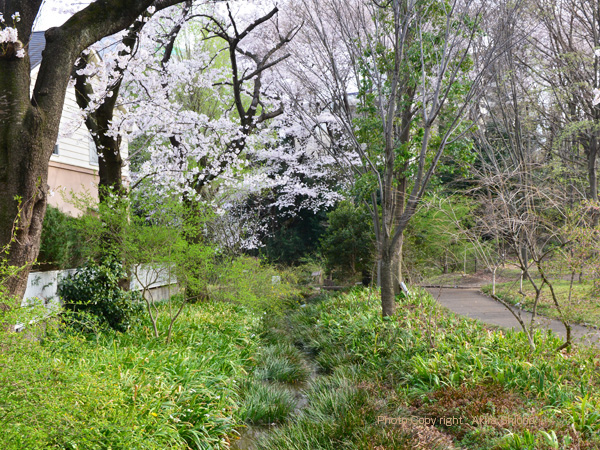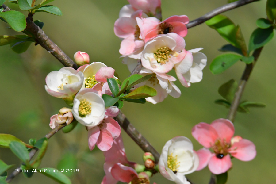 姿見の池に流れ込む、国分寺崖線の湧水の水路近くに咲く「ボケ」の花