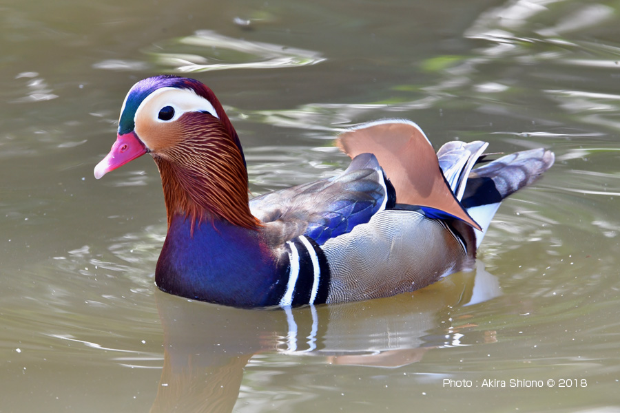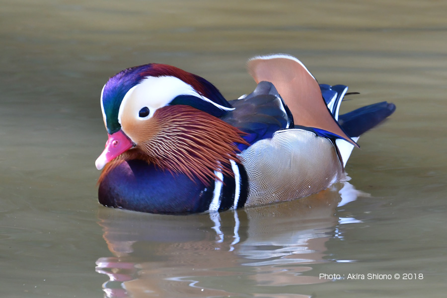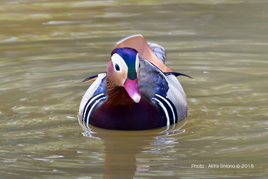 晴れの日のオシドリは胸の青色が鮮やかに見え、首の伸ばすと首羽は体に添います。