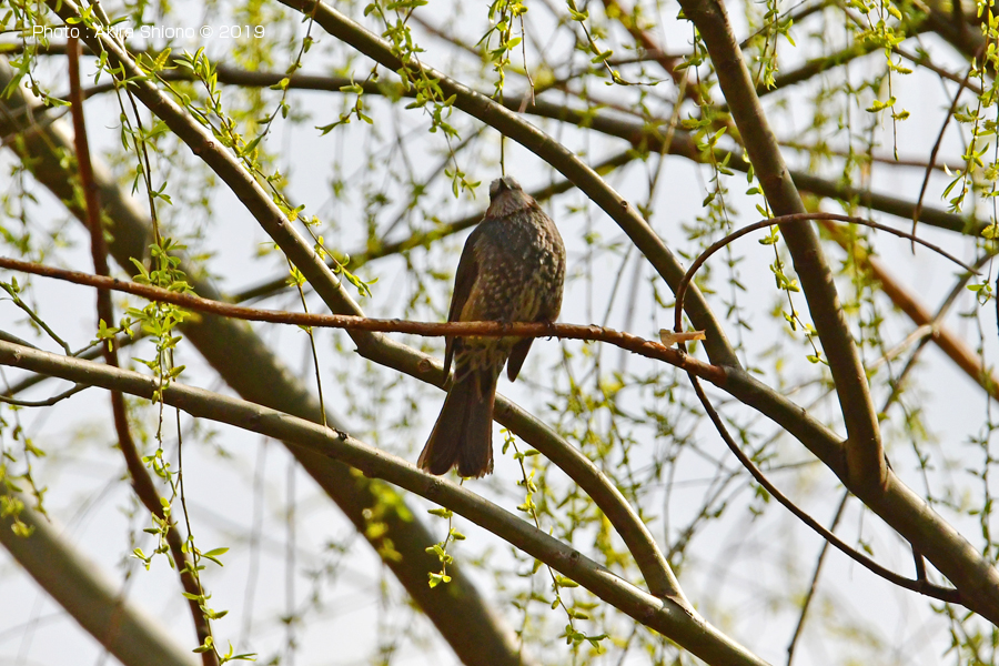 池の南側の線路沿いにあるヤナギ?の高い枝に留まるヒヨドリ。 3月下旬の姿見の池周辺の野鳥と花(2018)