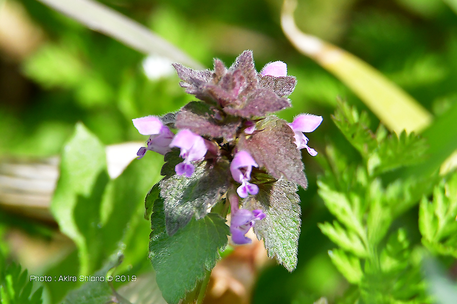 姿見の池に流れ込む水路の傍に咲いていた小さな姫踊子草(ヒメオドリコソウ)。