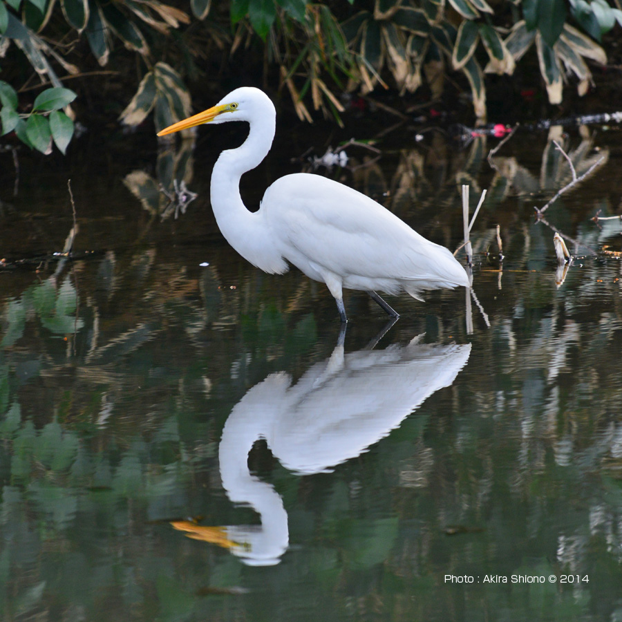 姿見の池の水面に映るシラサギの鏡姿。