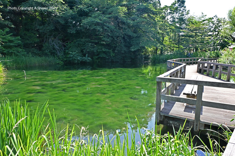 2023年の7月上旬はまだ梅雨の真っ最中です。しかし毎年のように大雨が降ったと思えば運良く晴れた日もあります。この姿見の池は起伏のある西国分寺駅東側の丘あたりから地面に染み込んだ雨水が東福寺東側から小川となって東に流れ、先で南に向きを変えて姿見の池に流れ込んでいます。 ![]() 池底一面が藻で緑になった姿見の池 撮影:NIKON Zfc+Z12-28mm f/3.5-5.6 VR DX15mm ISO 640 1/400 f/8 -0.3段