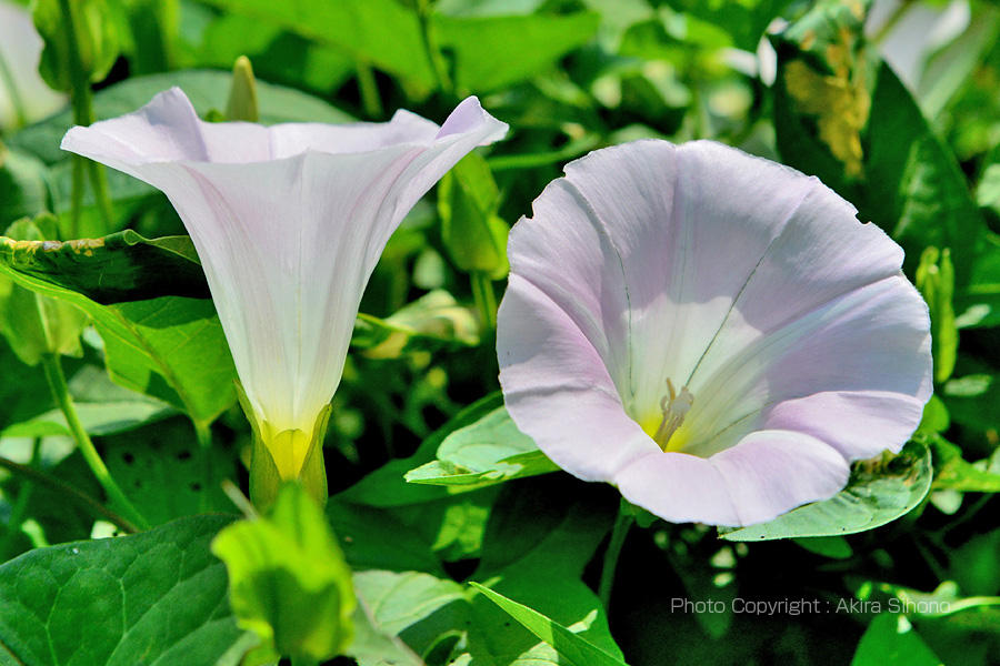 湧き水の流れる遊歩道の傍にはヒルガオが咲きます。わずかに青味がかっている薄いピンクのギボウシ この時期の湿地にはミソハギの花が若い緑の上に華やかに咲きます。