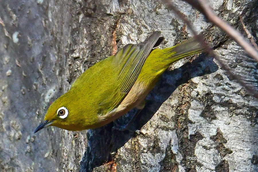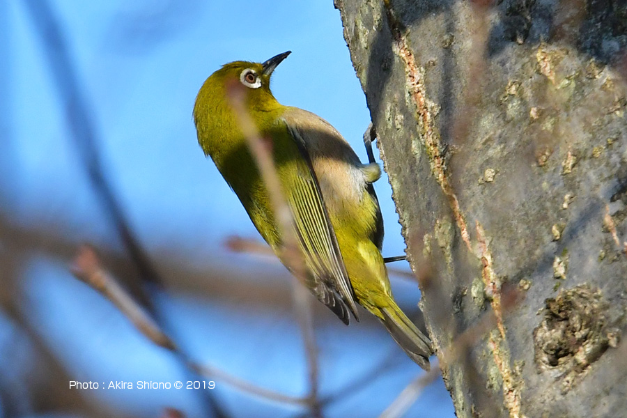 これから花が咲き出す2月、メジロは幹の虫も狙います。