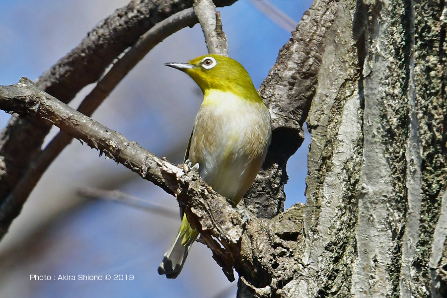 東京都府中市若松町にある浅間山公園は、府中市の北東に位置し、周辺の北東側には広大な多磨霊園、西側には、平和の森公園と府中の森公園があります。府中市のなかでも緑が多い区域となっています。 浅間山公園の野鳥2019.2.17 トップへ 2019年2月中旬に府中市の浅間山公園に、野鳥を見に出かけました。ここは散歩コースになっていて、日曜日だったせいか、年配や親子連れの方々がひっきりなしにみえていました。しばらく散策しましたが鳴き声は聞こえるものの、小枝や、常緑樹の葉に隠れてなかなか出逢うことが出来ませんでした。やっと見つけたのが、20m位先の幹に留まるメジロでした。梅の花咲く時期には好んで花の蜜を吸いに来ますが、時期にはまだ少し早いようで、木の幹に留まり表皮の溝にいる虫を探しているようでした。