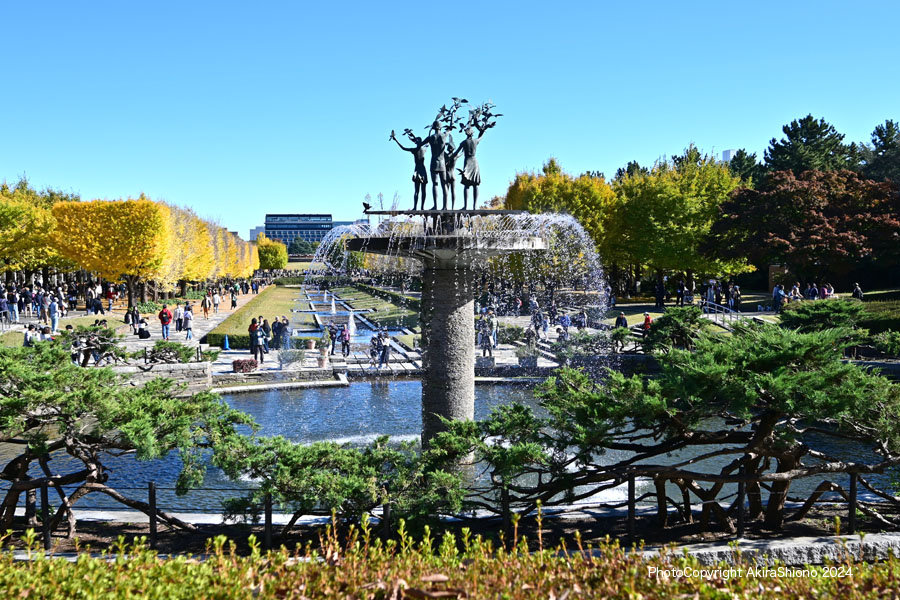 国営昭和記念公園は、広大な公園で立川駅に近い「あけぼの口」、「立川口」と西の「昭島口」、北西の「玉川上水口」と、北東の「砂川口」と青梅線の西立川駅近くの「西立川口」があります。 立川口ゲートを入ると、真っ先に目に飛び込んでくるのは、このカナールです。カナールは造園用語で「修景手法のひとつで細長い直線水路」を意味しています。全長200mの水路には大小5つの噴水があり、その両側には合計106本のイチョウが左右対称に2列ずつ植栽されています。 このイチョウは基地時代に植栽されたものを移植したもので、開園からの年月を経て見事な緑の回廊へと成長を遂げました。 秋には黄葉が美しく、昭和記念公園の二大黄葉スポットの一つとなっています。」
