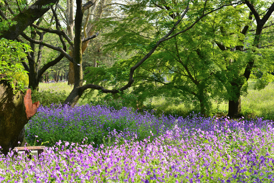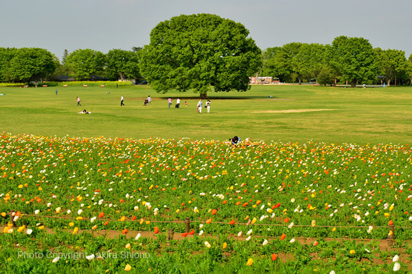 新緑の昭和記念公園 2013.4 四季の変遷: 1月 2月 3月 4月 5月 6月 7月 8月 9月 10月 11月 12月 移 動: 色とりどりの花で彩られた公園 色とりどりなポピー畑 ムラサキハナナと菜の花 新緑のこもれびの里と日本庭園 2014.4 チューリップガーデン2024.4 リンク: 昭和記念公園の4月下旬 昭和記念公園の4月上旬 昭和記念公園の3月下旬 昭和記念公園の12月 2月の日本庭園 昭和記念公園/新緑の園内 昭和記念公園/フラワーフェスティバル 13.11 昭和の時代展/自動車展 昭和記念公園砂川口の紅葉 昭和記念公園トンボの湿地 昭和記念西立川口 色とりどりの花で彩られた公園 トップへ 立川市・昭島市にある昭和記念公園では、2019年は3/23(土)〜5/26(日)までの間フラワーフェスティバルが行われています。 広大な園内のほぼ中央にある、会場は『みんなの原っぱ』の周辺です。ここに訪れたのは4月の下旬でしたので、FlowerFestivalのメインであった桜はとうに終わっていました。しかし、この時期には「ムラサキハナナ」、「ポピー」、「菜の花」が咲いていて、西側にある渓流広場の両岸一体にはチューリップガーデンがあり、22万球のチューリップの各花々が鮮やかに広がっています。