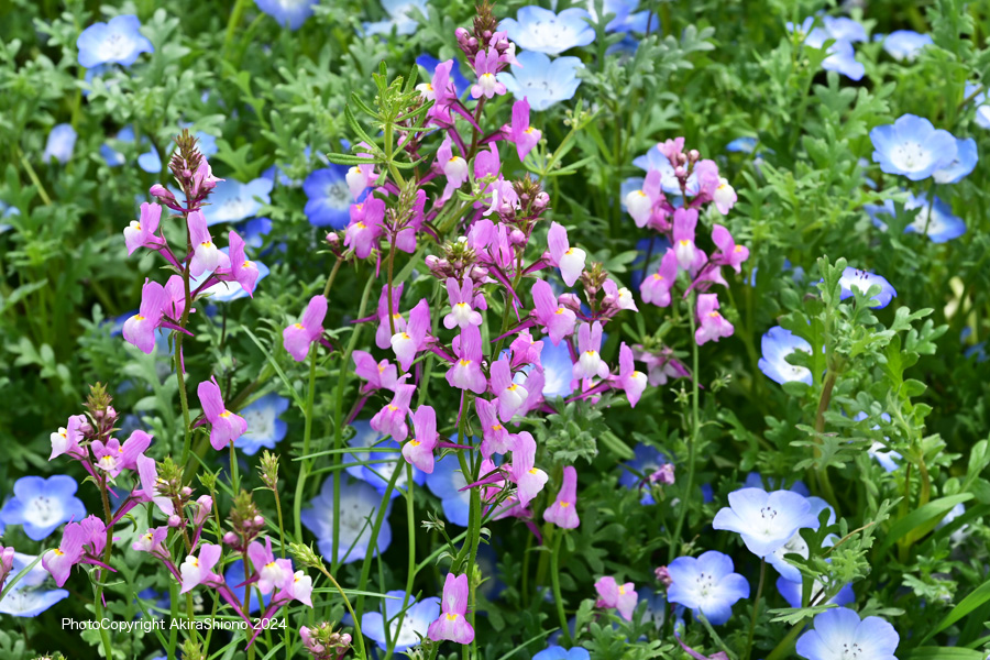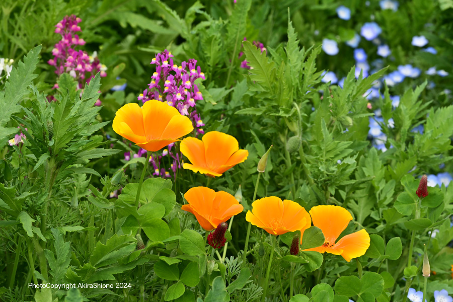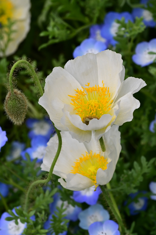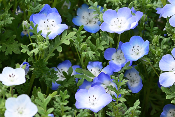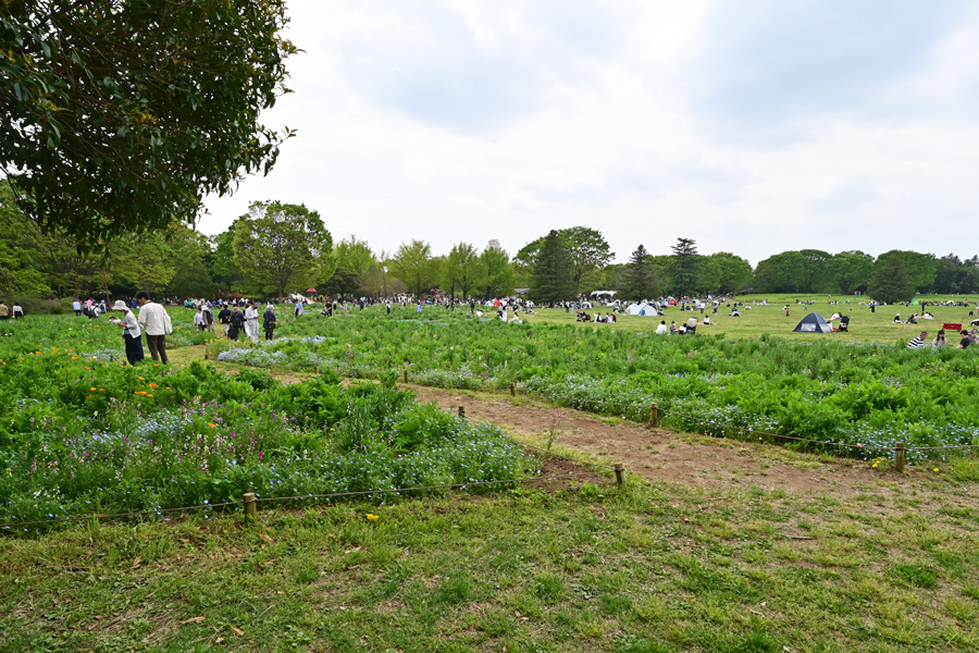 「みんなの原っぱ」の東花畑のエリアの花々で地面近くにはネモフィラが咲いています 撮影:NIKON Z7 Z24-120mm f/4 FX:102mm ISO 100 1/200 f/9 -0.3段 1.5倍トリミング 撮影:NIKON Z6II T70-300mm f/4 FX:96mm ISO 100 1/250~400 f/9 -0.3段 3.5倍トリミング