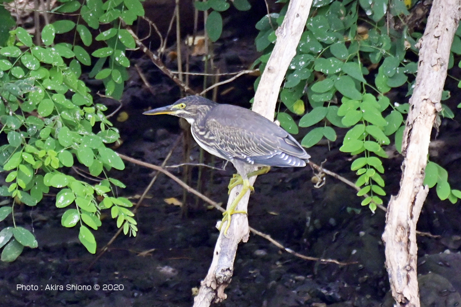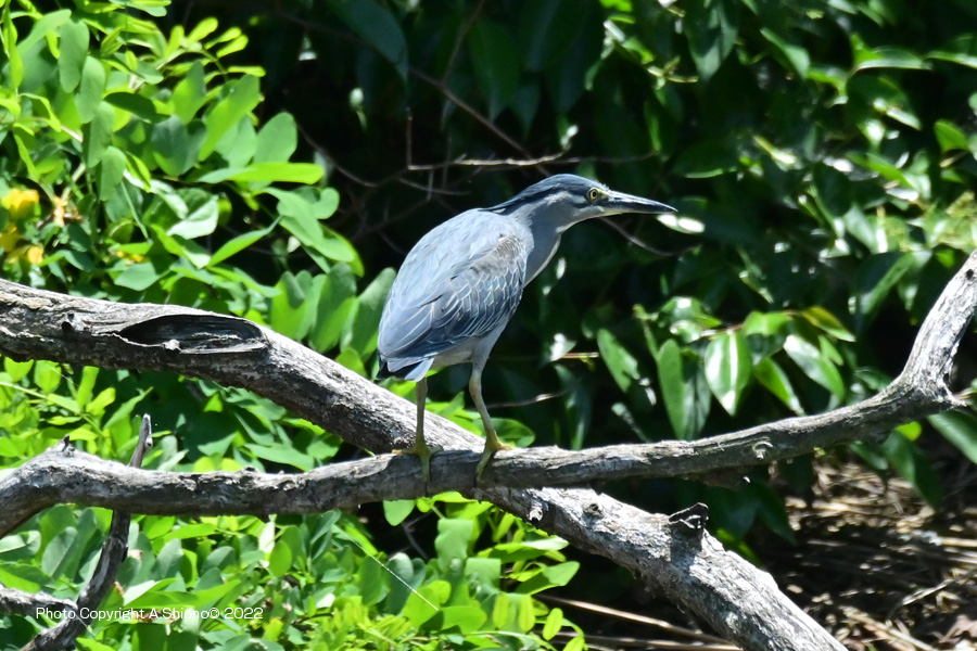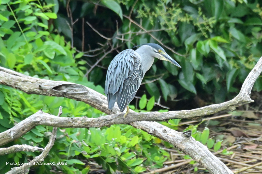 対岸の生い茂る木々の中の枝に留まるササゴイ。