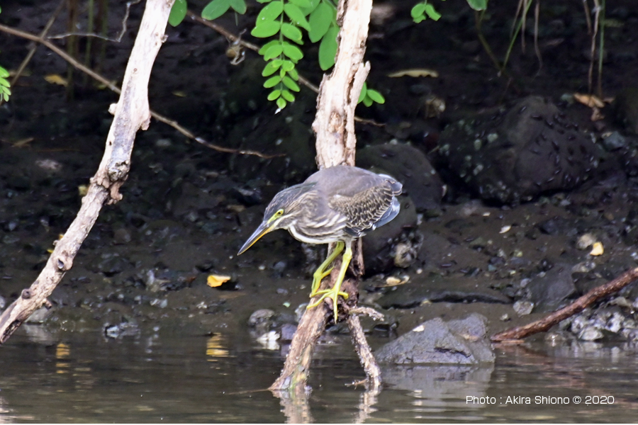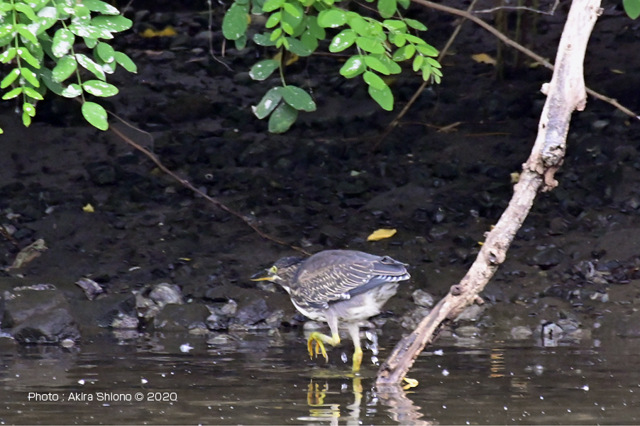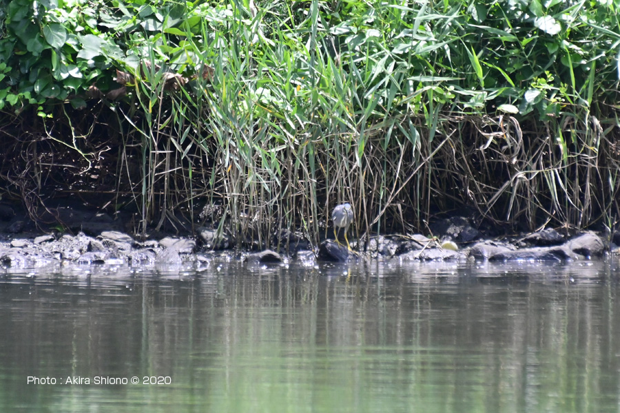 約60m先の対岸を探していると、なにやら景色に溶込んている野鳥と発見しました。最初はゴイサギの若鳥(幼鳥?)かと思いファインダーをのぞいていました。しかしなにやらゴイサギの幼鳥(ホシゴイ)とはちょっと違うかな?と思いさらに確認を続けました。以前撮影したゴイサギの幼鳥(ホシゴイ)と比べてみました。 ![]() 約60m先の対岸で見つけたササゴイ