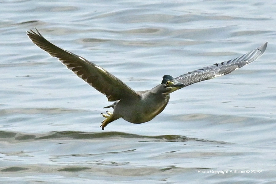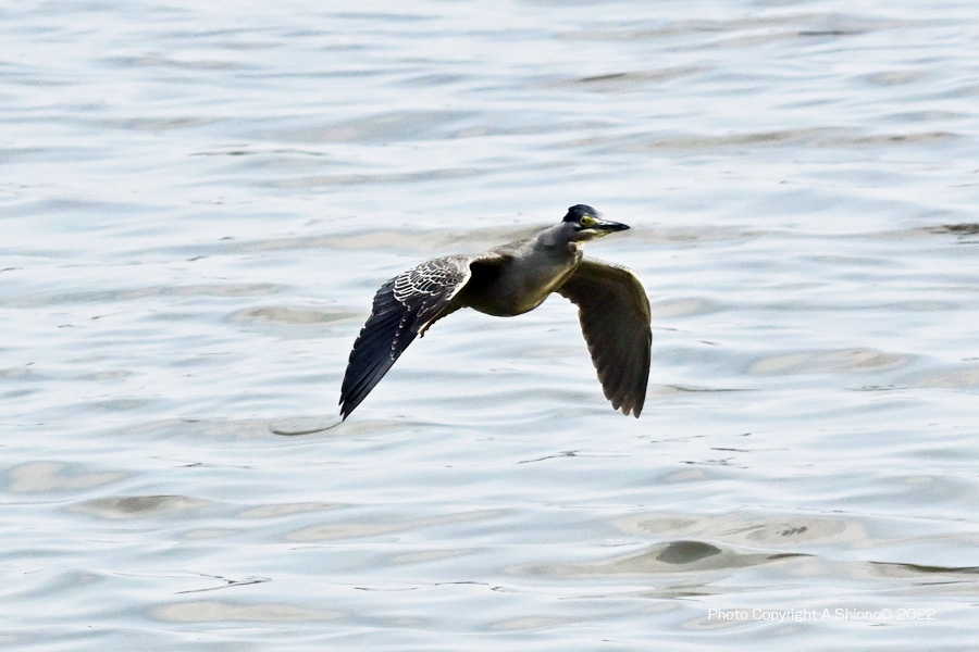 餌の居そうな磯場を探し回るゴイサギ ![]() 海面すれすれを飛びながら次の岩を目的にします。