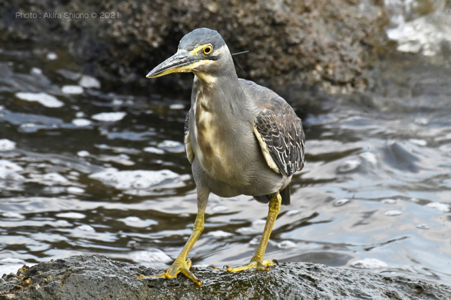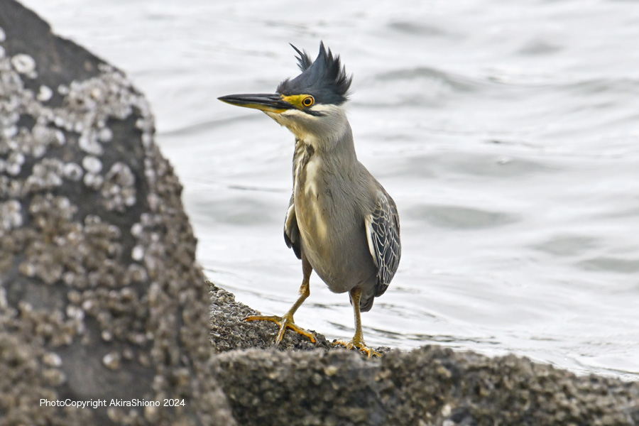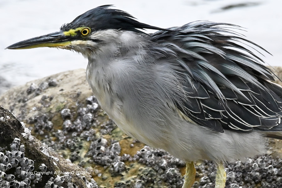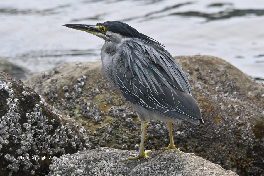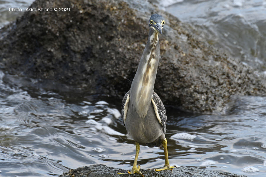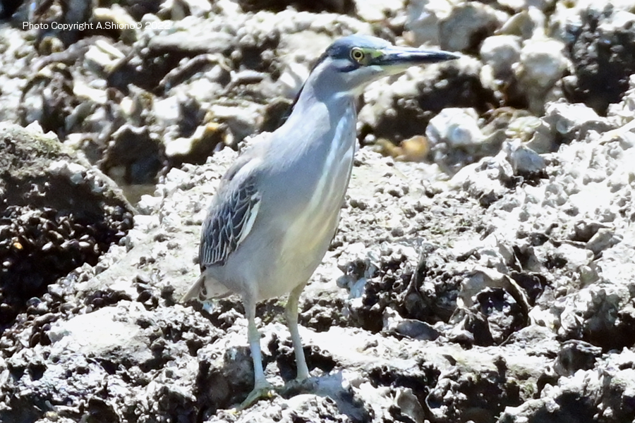 仕舞っていた首を伸ばして、岩場のあたりを確認するササゴイ。(画像クリックで拡大します)