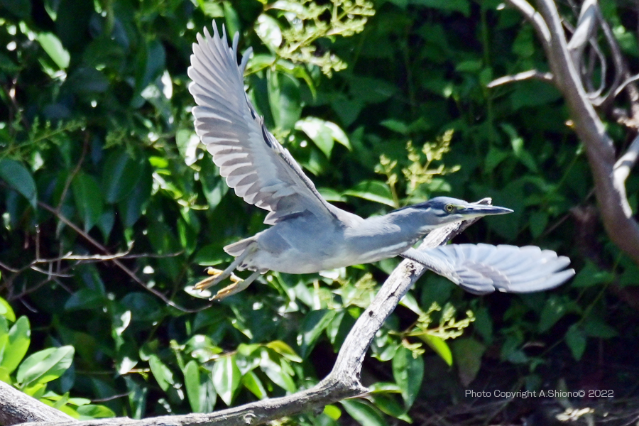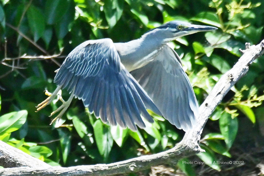 対岸の生い茂る木々の中の枝先から飛び出したササゴイ。