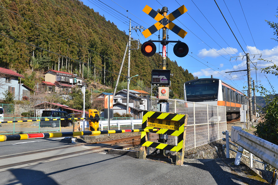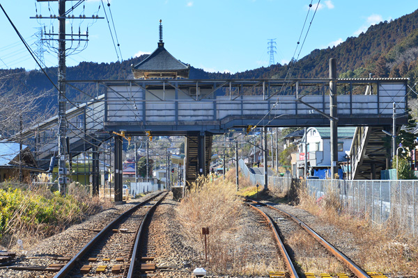 上の写真は沢井駅の東側(立川側)にある「塚瀬踏切」から沢井駅東側を見た所です。この特徴的なのな跨線橋の上に寺院の屋根の様な建築物があることです。北側にある雲慶院のお寺が関係しているかも知れません。このちょうどホームに繋がる階段辺りと思われます。 沢井周辺の観光地 トップへ