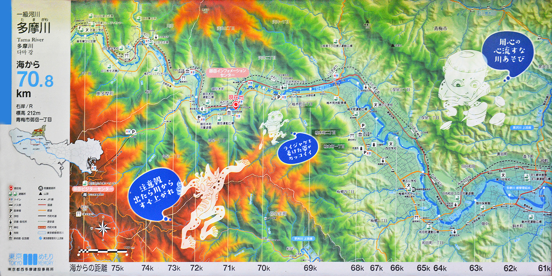 東京西多摩建設事務所の作成した「一級河川 多摩川」のマップです。これは、比較的観光客が多い、御岳小橋の左岸と右岸に設置されています。ここには、最近遊歩道に設置された海からの標識を作成した『東京めもり」と同じロゴが入っています。このマップはこの御岳小橋の辺りが、海から70.8kmのの位置にあるというマップです。
