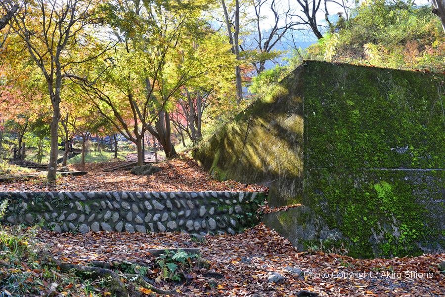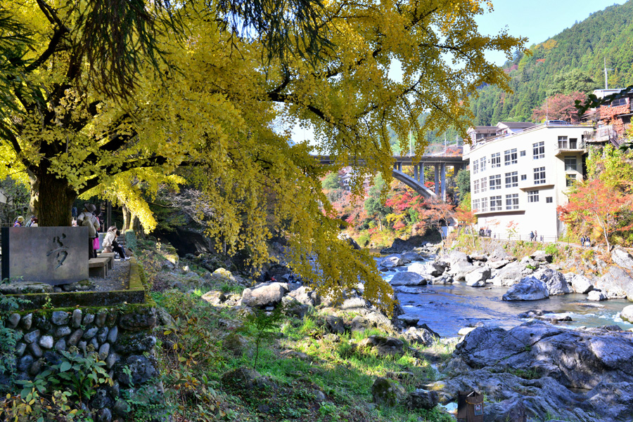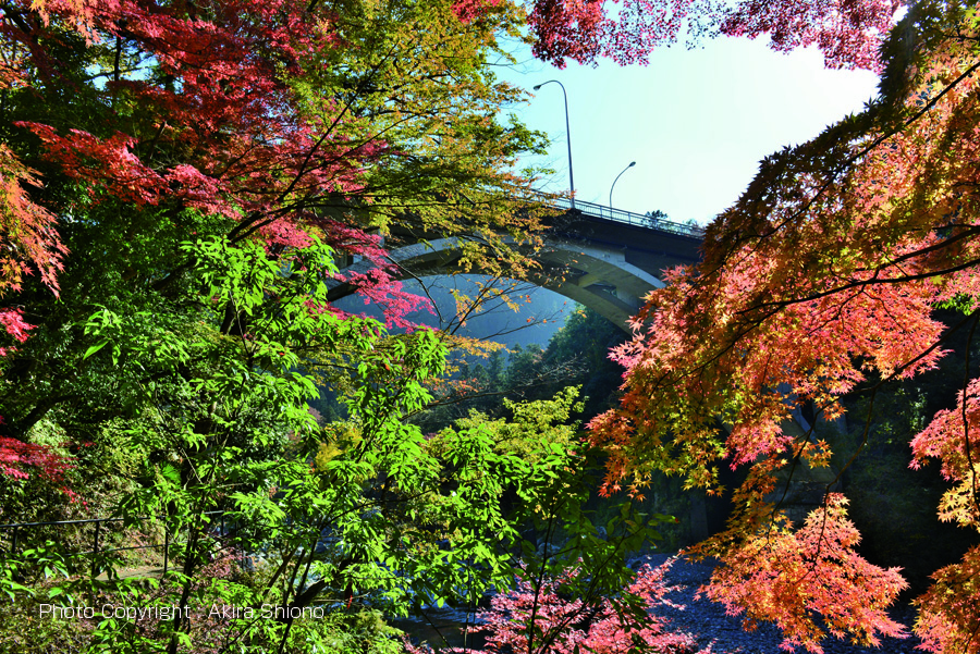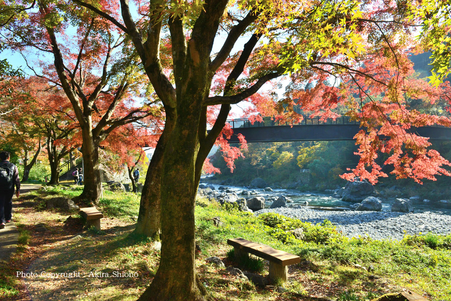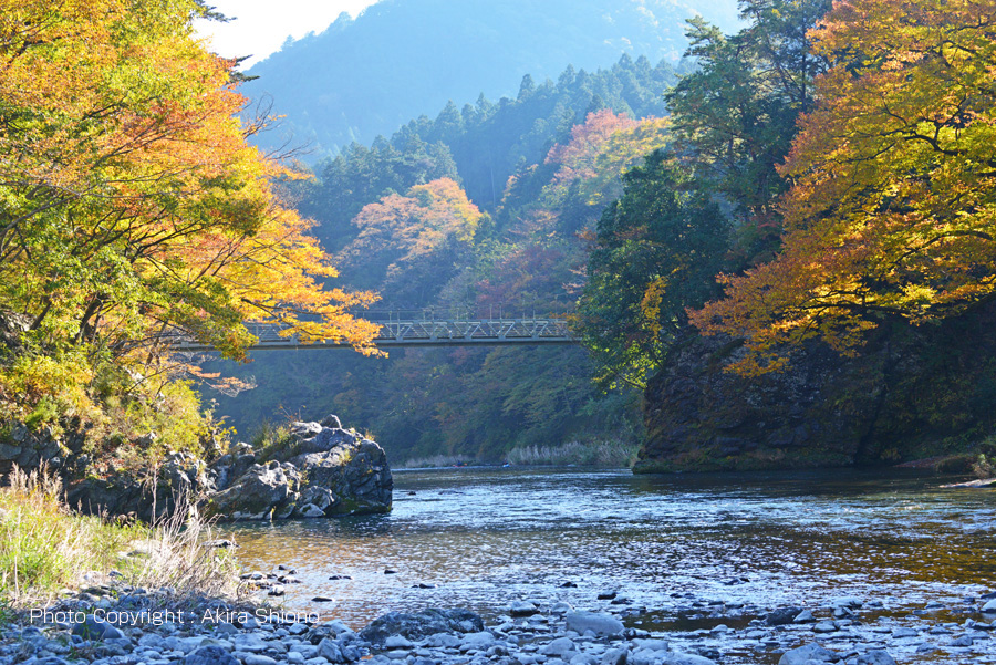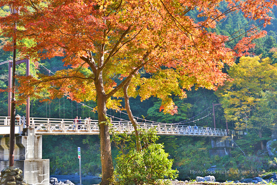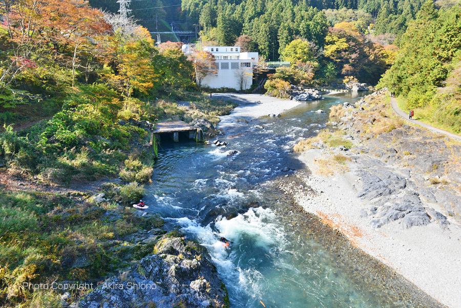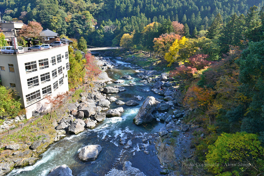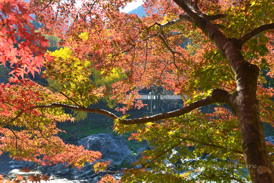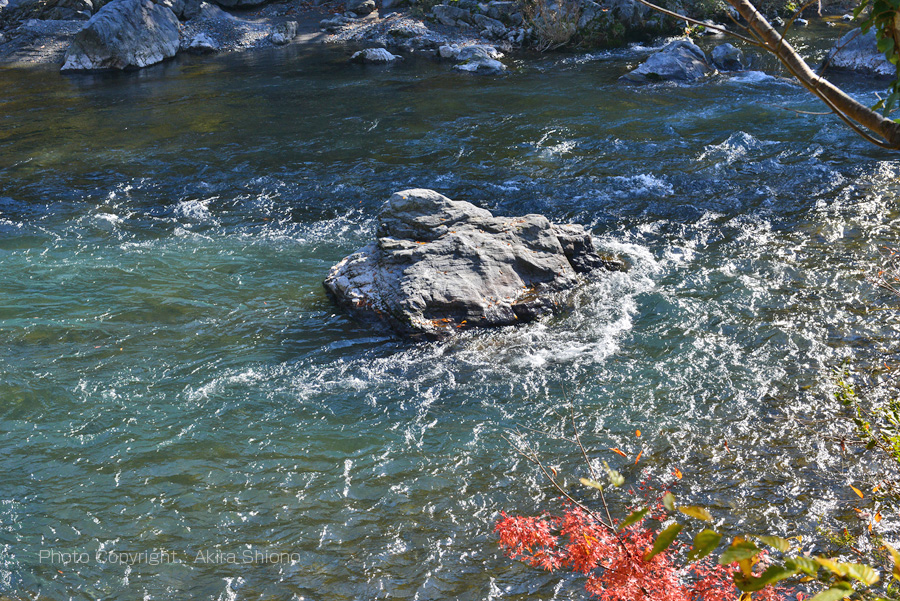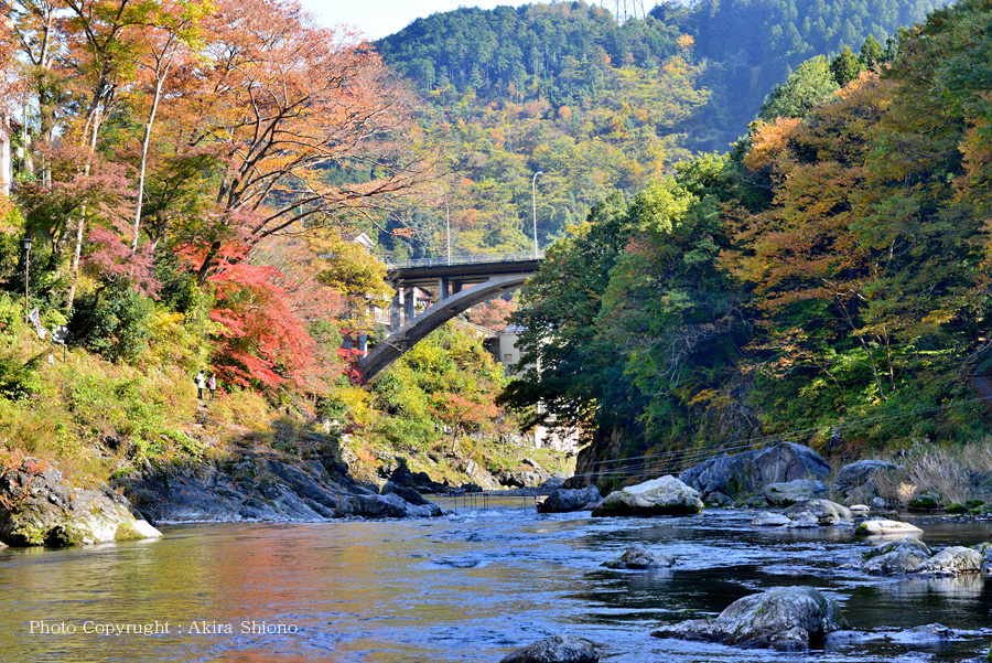 11月の下旬に紅葉を求めに、澤井へ行ってきました。この奥多摩周辺の川は趣味の釣りで10年近く訪れています。その景色の記憶をもとに今回はカメラを担いで紅葉の写真撮影です。車を出し目的地に向かうと寒山寺駐車場は運良く空いていました。早速支度をして、急坂の寒山寺側の山道から降りることにしました。坂を降り楓橋を渡りきると、ここは豆腐料理で有名な“ままごとや”があったり、清流を見ながら食事が出来る“澤乃井ガーデン”、また上の国道を渡ると澤乃井で有名な“小澤酒造”があり見学も出来ます。先ほどの澤乃井ガーデンには利き酒処がありますので日本酒がお好きな方には、有料で数々の日本酒を利き酒することができます。この日は、紅葉狩りの観光客でごった返していました。ご年配の団体の方々が遊歩道を観光していました。景色が素敵なこの遊歩道は道幅が狭く川側は崖になっており保護柵がありません。平日でもギリギリの道幅ですが、この日は人が多くすれ違うのに非常危険です。譲り合いの気持ちが大切ですし、譲ってもらった方は軽くお礼をしましょう。 〔写真をクリックすると拡大されます 戻るボタンで前の画面に戻ります〕