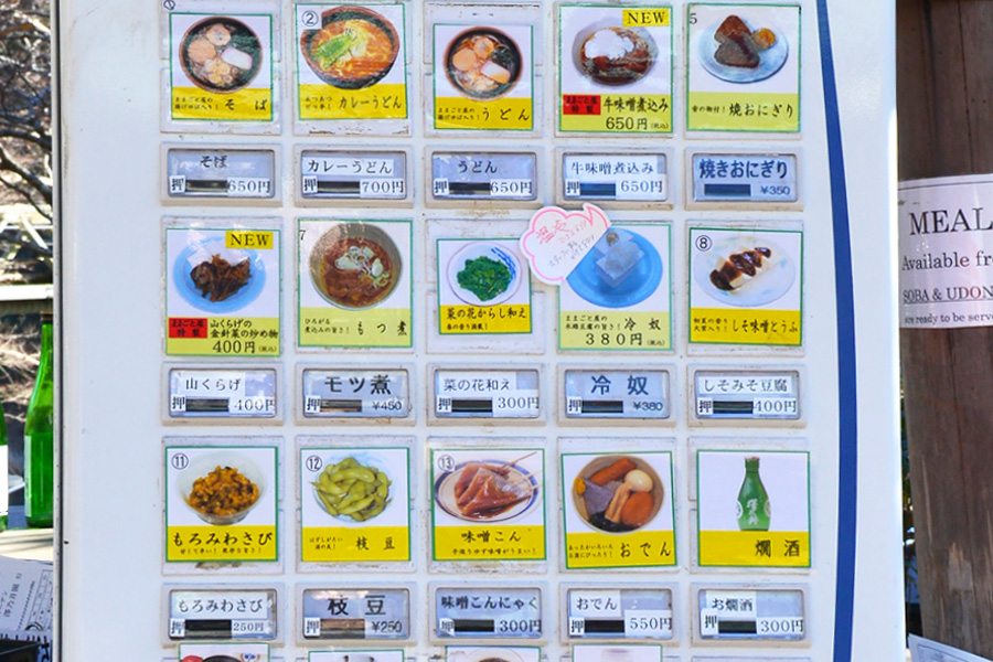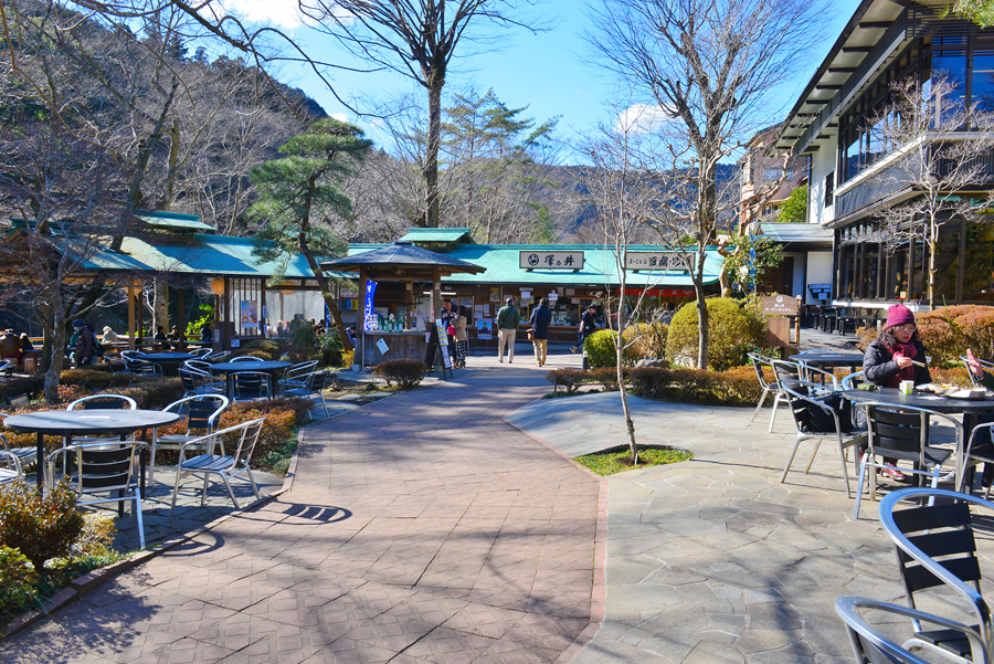 澤乃井園はフードコートになっていて、食券を購入し注文します。右手建物2階には「利き酒処」があります。