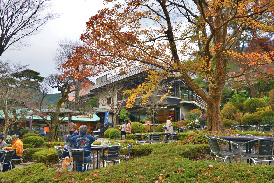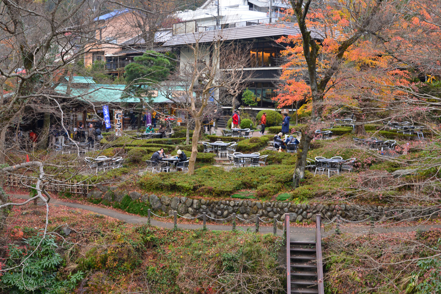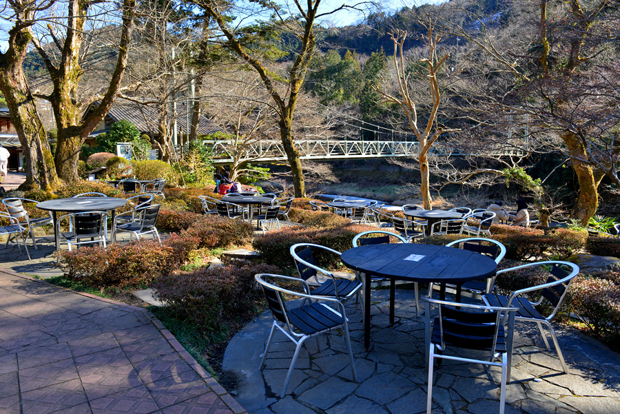 園内にはテーブルとイスが配置され、楓橋を背景に飲食が出来ます。