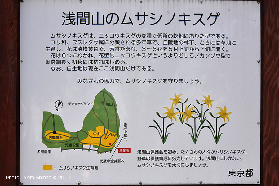 浅間山公園の中山に通じる階段と浅間山のムサシノキスゲの説明板 ![]() 中山に設置されている浅間山公園案内図